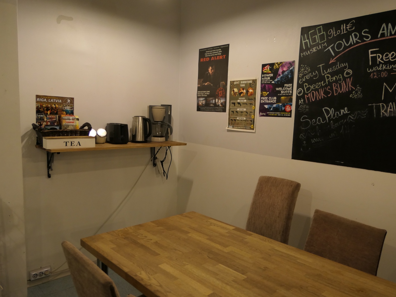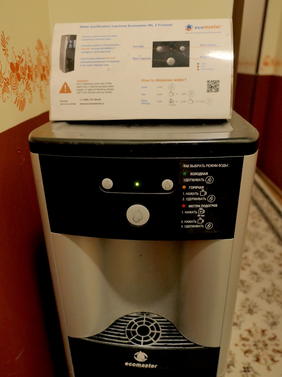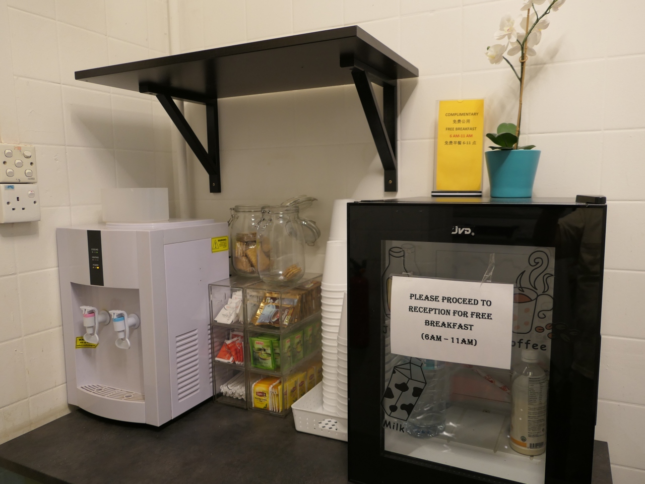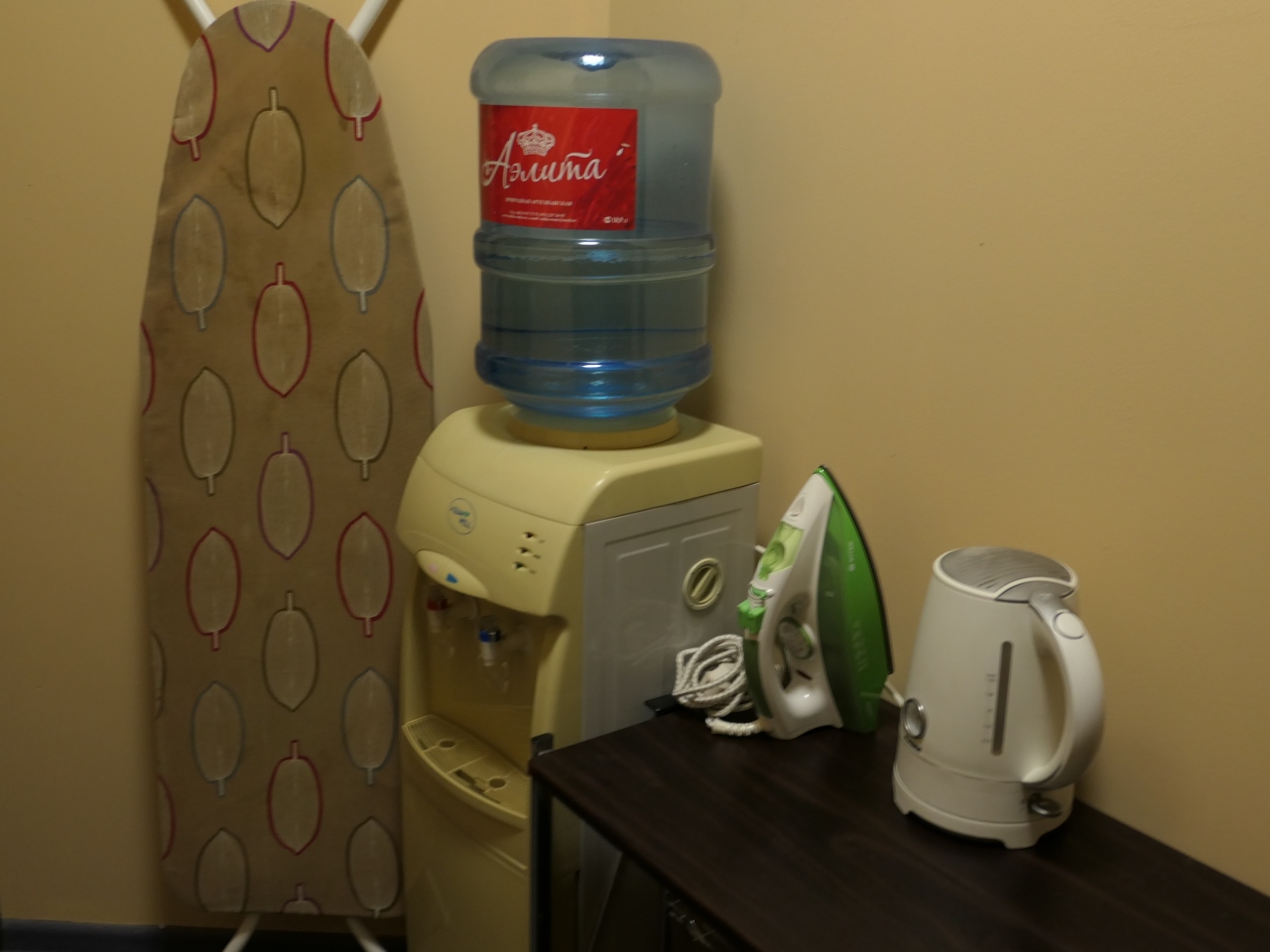 廊下には、飲料水や共用のポット、アイロンなどがあります。