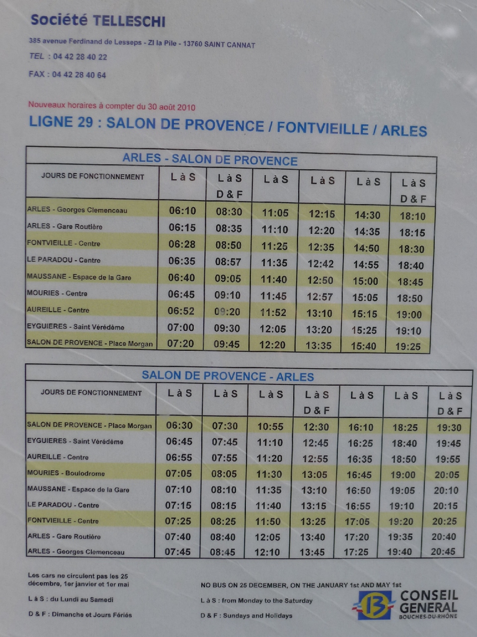 「地球の歩き方」によれば、レ・ボー・ド・プロヴァンスへのバスは、7・8月と5~9月の土日のみ運行と記載されています。