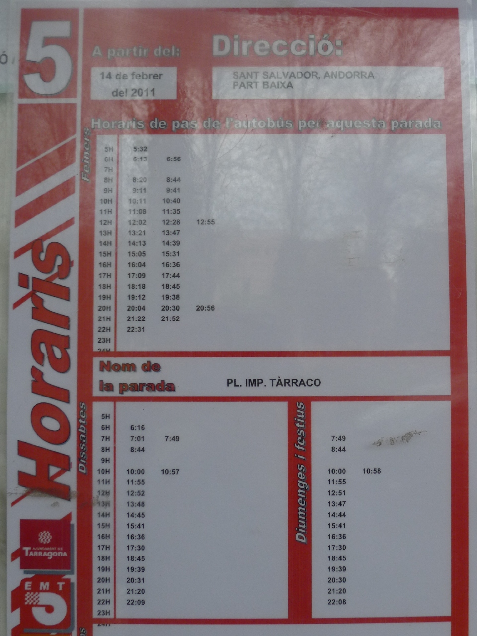 バスで行く場合は、地中海のバルコニーからランプラ・ノバ通りを1kmちょっと(徒歩20分程度)行ったところの「インペリアル・タラコ広場」(交差点の中央に公園の大きなロータリーがあります)のバス停から5番のバスに乗ります。