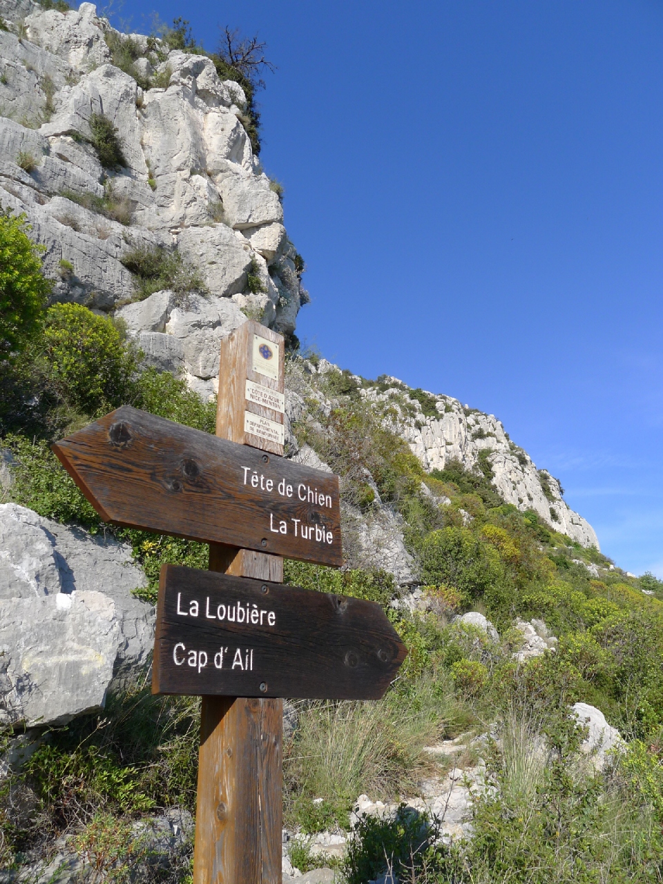 ラ・テュルビーを観光した後、今度は南方向に尾根に近い道を歩いて行くと、30分程度で、「Tete de Chien」(フランス語で「犬の頭」らしい)という展望台に出ます。
