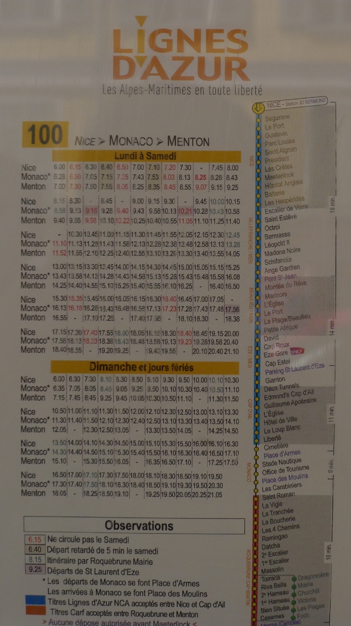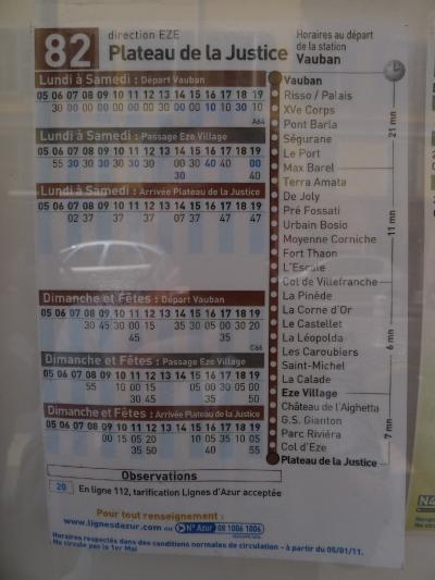 このバス停は、エズを経由する82番とロクブリュヌを経由するマントン行き100番が停まります。