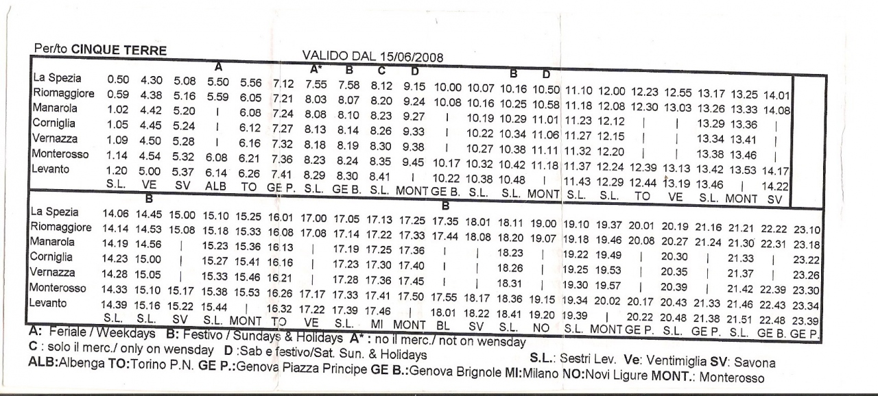 チンクエテッレ付近の鉄道の時刻表を現地で入手しました。