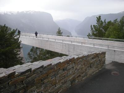 アウルランフィヨルドを見下ろす展望台「Stegastein」まで小型のバスで往復するエクスカーションがありました。フロムのインフォメーションでチケットを買って、駅を出たところにバス停があります。往復150NOK。アウルランという町から上って行きます。展望台では約20分停車、アウルランフィヨルドを見渡せるほか、アウルランの町をほとんど真上から見下ろせます。私が行ったときは、あいにくの天気でいまいちでしたが、天候に恵まれれば素晴らしい光景だと思います。フィヨルドはフェリーから見上げるのが一般的ですが、上から見下ろせるポイントに、この価格でお手軽に行けるのはかなり価値ありと思います。