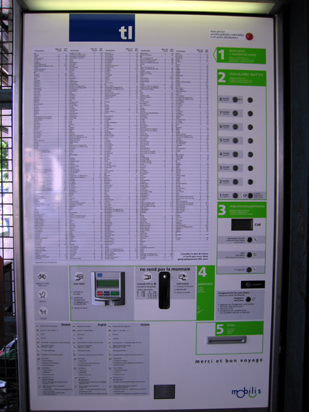 切符販売機は、現金ならユーロの硬貨だけ(札やスイスフランはダメ)。あとはクレジットカード(VISA、マスター)、フランスのバンクカード、ユーロカードだけです。それのICチップ付きでないとダメ。
