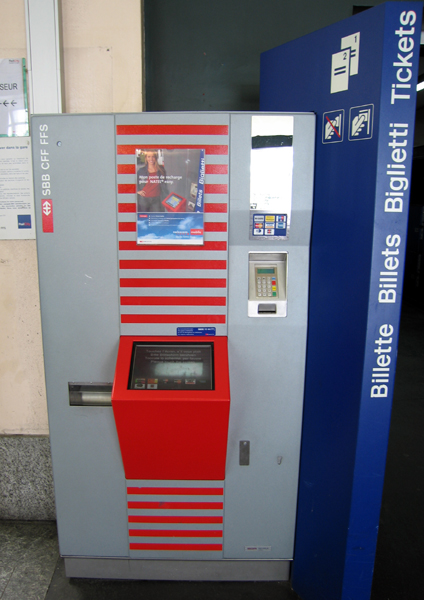 スイス国鉄の自動券売機は、赤と青で目立ちます。