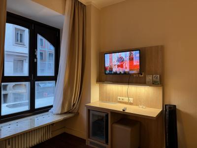グランプラスの中にある小さな三つ星ホテルです。6階のグランプラスビューの部屋に泊まりましたが眺めは最高で広場の特等席でした。夜19時以降は入り口の鍵が施錠されますので自分で鍵を持参して開ける必要があります。エレベーターは旧式でカゴタイプ、壁は剥き出しで乗り降りする時は手動です。上りのみ利用可能で部屋から出る時は階段利用しないといけない約束事有、6階からの階段は70段。ポット、バスタブあり、部屋は清潔です。冷蔵庫、エアコンはありません。扇風機とヒーターがあります。スタッフは驚くほど親切で対応は素晴らしいの一言。ブリュッセルに来たらまた泊まりたいホテルです。
