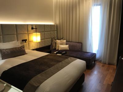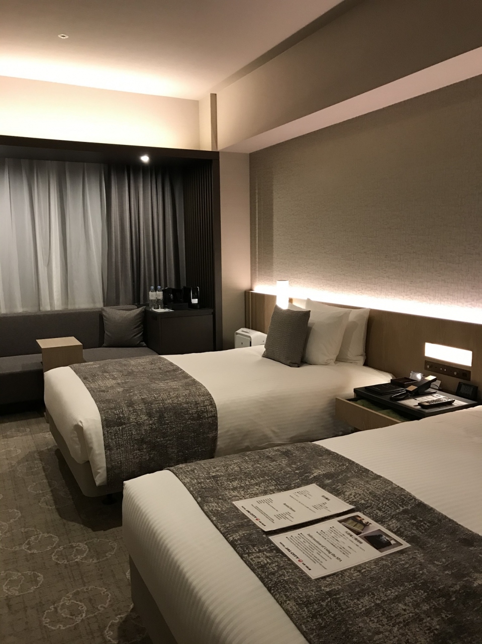 ハッキリ言って狭いです。マイナスポイントはこれだけです。とにかく築浅だから綺麗で大浴場が広くて一階には無料で飲めるドリンクがありリンゴジュースが美味しかった。カフェスペースで新聞読みながらコーヒー飲んだりできます。朝食がとっても美味しかった。本来ならバイキングですが、感染対策でプレートでしたがお変わりをお願いできます。ホテルは寝るだけで朝食利用、アクティブな方にオススメです!リーズナブルでまた泊まりたいホテル。
