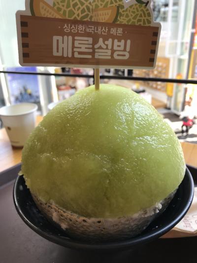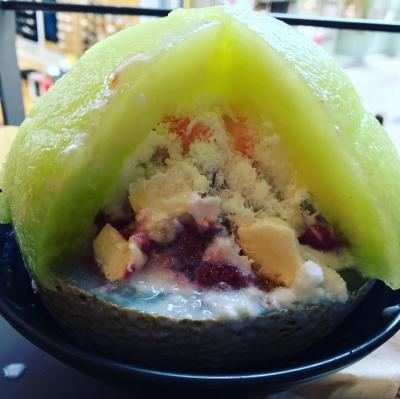 価格は高めですが、メロンの果肉の下にはふわふわのかき氷とチーズケーキ、苺、ヨーグルトアイスが入っていて色んな味が楽しめます。平日昼時だったせいか、店内には1組しかおらずガラガラでした。1人で食べるには量が多く、シェアして食べました。- 旅行時期
