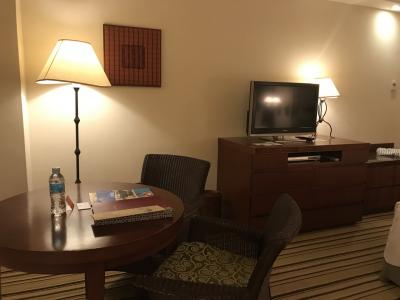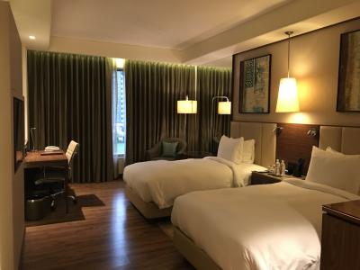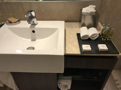 ヒルトングループの中では格下のホテルなのでアメニティーが見慣れないものでした。しかしヒルトンならではのサービスで安心して宿泊できました。バスローブ、スリッパ、アイロンがありました。部屋、リネンやタオル類は清潔でした。宿泊した夜は結婚式があったので打上げ花火が部屋の窓からきれいに見えました。明け方まで騒音が気になりましたが、お祝い事なので不思議と腹立たしいとは思いませんでした。夕食、朝食ともレストランを利用しました。朝食のライブキッチンでオーダーしたオムレツが特に美味しかったです。