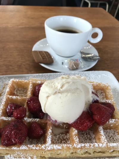 ブリュッセル風のベルギーワッフルを注文し、トッピングは苺とアイスクリーム。アイスクリームは中にクッキーが入っていて甘いですが、ワッフルが甘くないのでバランスが良く美味しかったです。トッピングはチェリーも人気でした。コーヒーは普通でした。テイクアウトと二階のサロンで座って食べるのではワッフルの価格が違います。テイクアウトの方がリーズナブルでした。