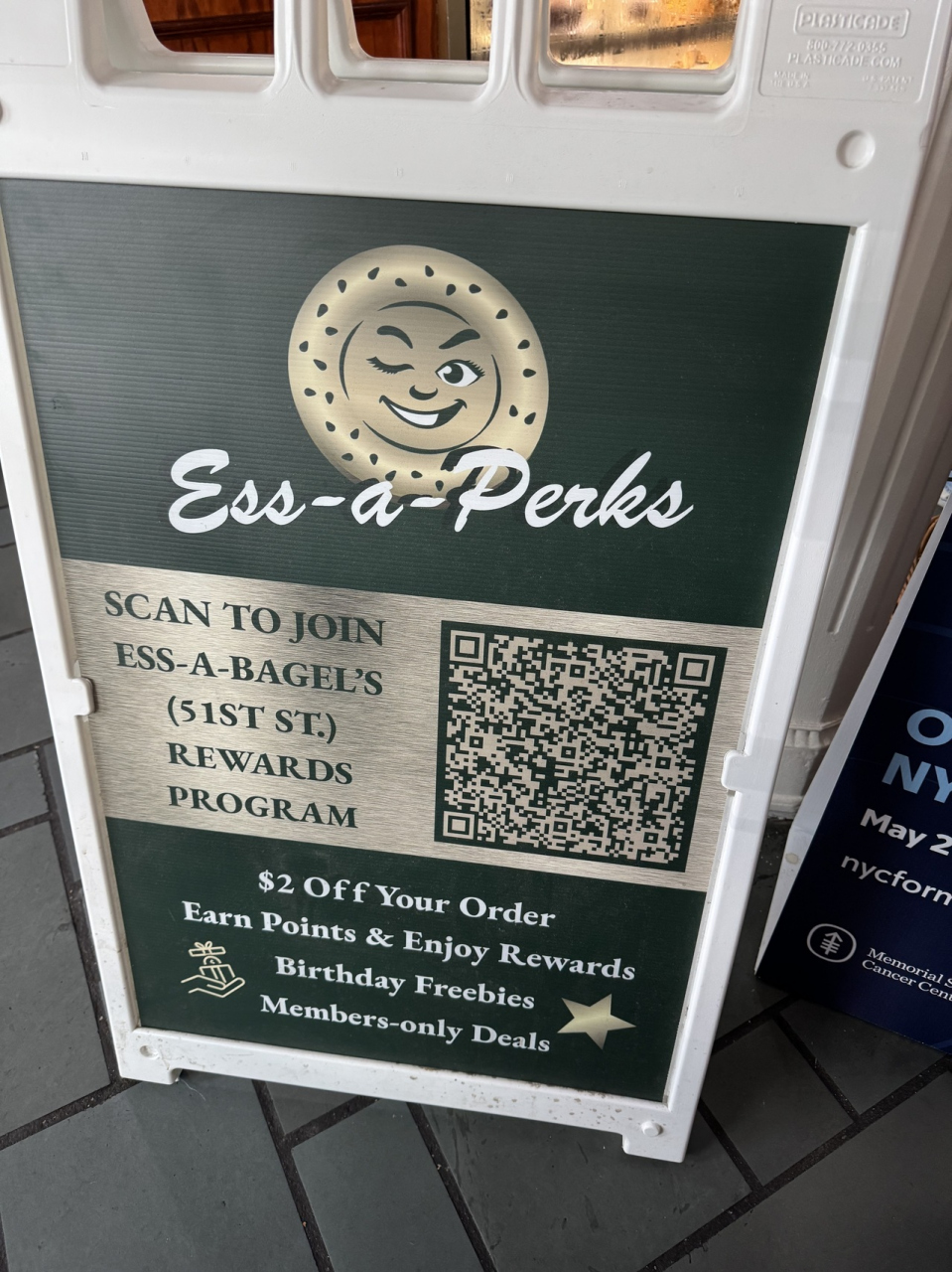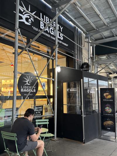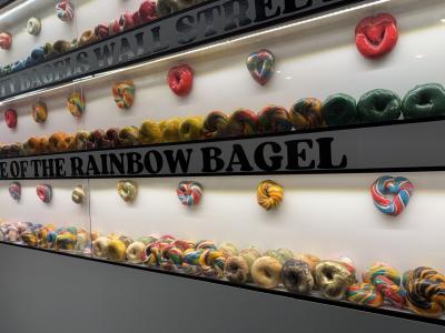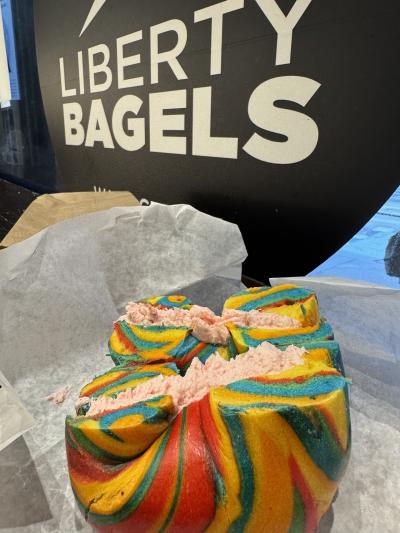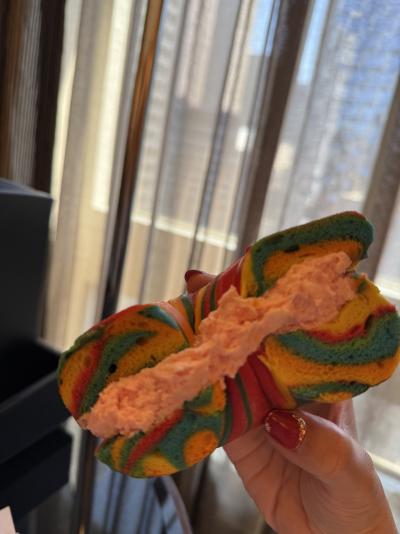 店舗はブルの近く、ロウアーマンハッタン店を利用。ベーグルはレインボー、クリームチーズはガラスケースを確認して最も減りが早いストロベリーを注文しました。奇抜なビジュアルですが、ベーグルの味はプレーンとあまり変わらなくてモチモチで美味しいです。ストロベリークリームチーズは好みの味でドストライクなテイストでした。優しい甘さが最高。朝食後に訪問したので半分でお腹いっぱいになり残りは持ち歩き、ホテルに帰ってから食べましたが風味は変わらず美味しく頂きました。とても美味しかったので次回ニューヨークに来たら再訪してお土産にも買って帰りたいと思いました。店内はイートインスペースがあり、1番奥にトイレがあります。スイーツ系ベーグルが食べたい方におすすめです。