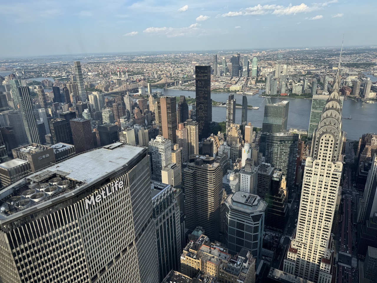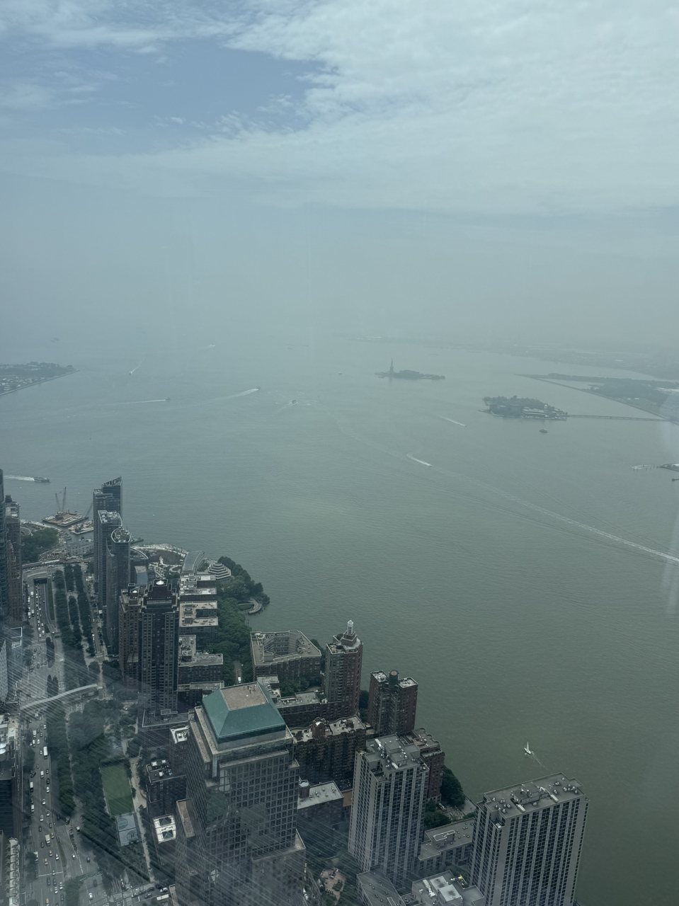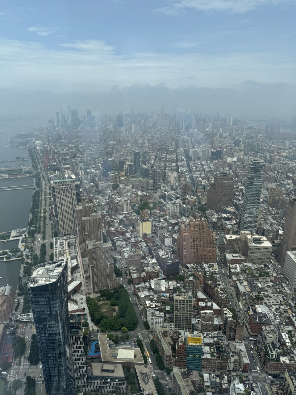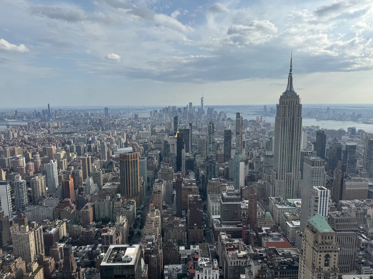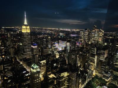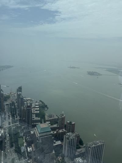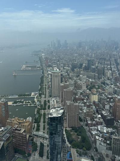 全米一の高さを誇るビルからの眺めはどんなものか興味があり展望台へ上がりました。エレベーターであっという間に到着しますが、マンハッタンの過去から現在に至るまでの映像がエレベーターの高さに合わせて映像が流れどんどん移り変わる様子が面白い。僅かな時間で歴史を知る事ができ興味深かったです。展望台は100階から102階で360度、眺望を楽しめます。空いているので焦ってチケット購入せず、晴れた日に行くことをオススメします。展望台は他の日に変更かギリギリまで迷いましたが既に真下にいたので、少し霞んでいる日に上りました。景色はそれなりに楽しめましたが、別日の晴れた日に改めて展望台へ行けば良かったと少し後悔。晴れているとマンハッタンの絶景が見られます。ちなみにiPadの解説は別料金です。必要は感じなかったので断りましたが、持っていた観光客は3割程度の印象てす。空いていたのでマンハッタンの眺望をゆっくり楽しめて良かったです。
