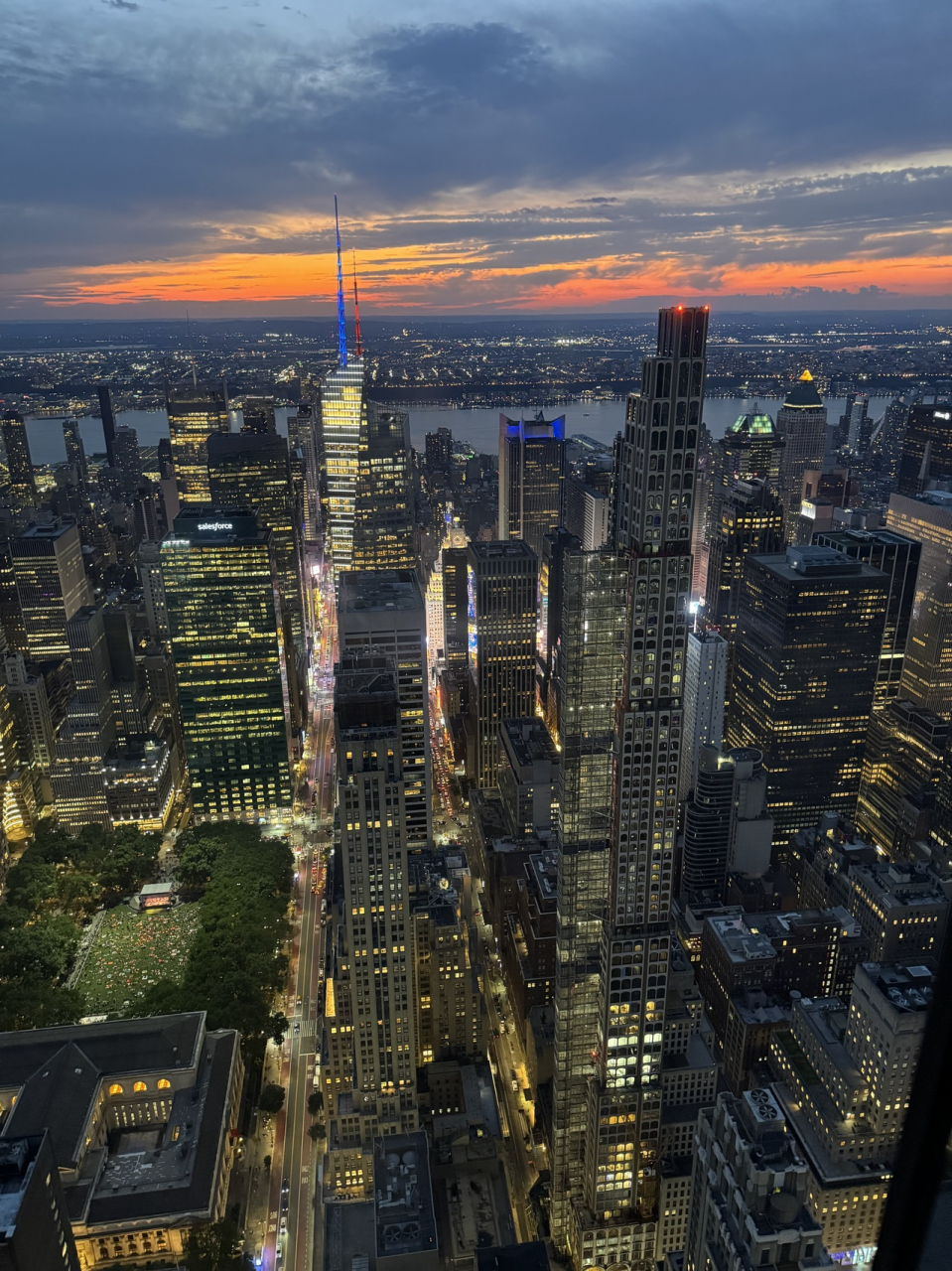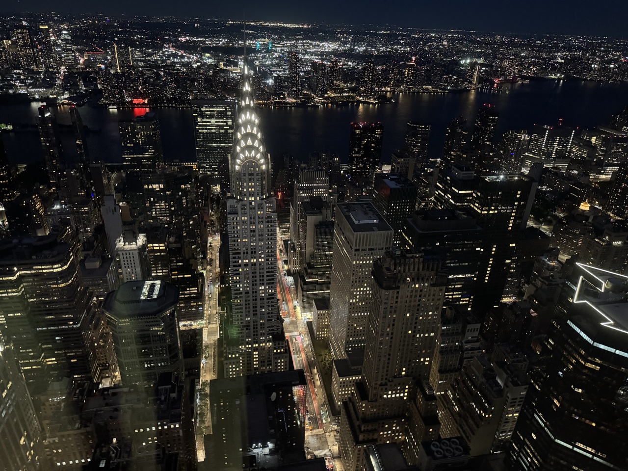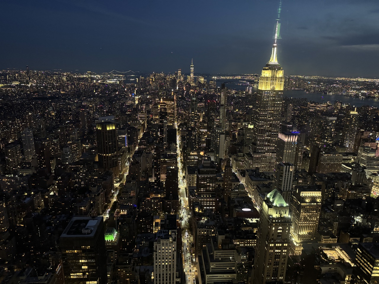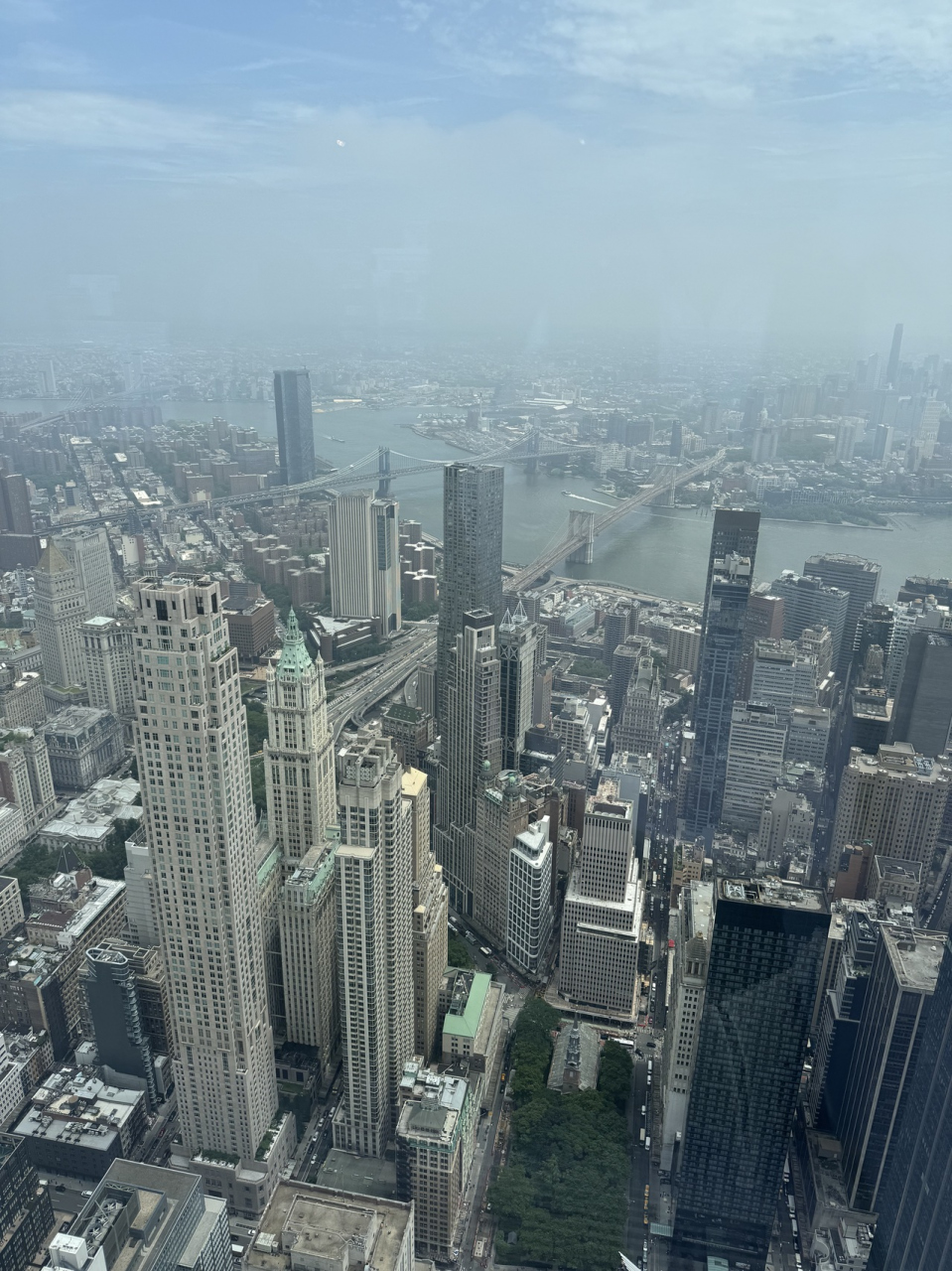 全米一の高さを誇るビルからの眺めはどんなものか興味があり展望台へ上がりました。エレベーターであっという間に到着しますが、マンハッタンの過去から現在に至るまでの映像がエレベーターの高さに合わせて映像が流れどんどん移り変わる様子が面白い。僅かな時間で歴史を知る事ができ興味深かったです。展望台は100階から102階で360度、眺望を楽しめます。空いているので焦ってチケット購入せず、晴れた日に行くことをオススメします。展望台は他の日に変更かギリギリまで迷いましたが既に真下にいたので、少し霞んでいる日に上りました。景色はそれなりに楽しめましたが、別日の晴れた日に改めて展望台へ行けば良かったと少し後悔。晴れているとマンハッタンの絶景が見られます。ちなみにiPadの解説は別料金です。必要は感じなかったので断りましたが、持っていた観光客は3割程度の印象てす。空いていたのでマンハッタンの眺望をゆっくり楽しめて良かったです。