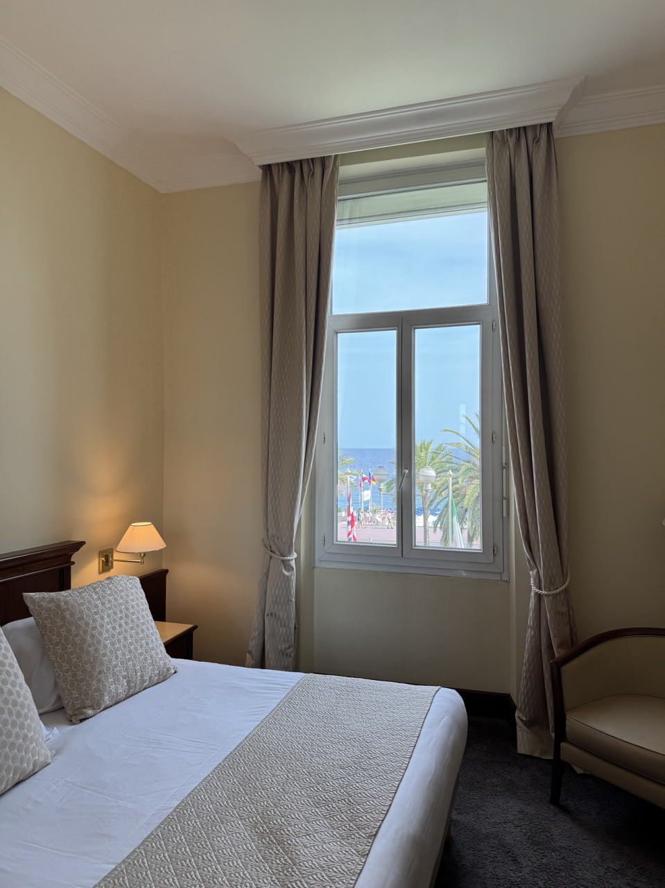 ニース空港から便利な立地で最寄駅Grand Arénasまでトラムで一本。駅は地下ですがエレベーター有ります。駅から徒歩7分、ホテル周辺は特に治安が良い地域でプロムナードデザンクレの前、夜遅く散歩している人がたくさんいました。バス停はホテルの直ぐそば。マセナ広場、旧市街、展望台徒歩圏内。ビーチ目の前でホテルのプライベートビーチ有り。シービューの部屋がオススメ、ニースの美しい海が部屋から楽しめます。朝食は種類豊富でとても美味しく、夜のバーは生演奏を聴きながらお酒が楽しめます。初日はボトルのミネラルウォーター、チップス、ディップがウェルカムサービスで無料。フロント横のロビーにコーヒー、ミネラルウォーターマシーンがあります。部屋は清潔でリノベーションしてるのかきれいでした。トイレ独立型、バスタブ、スリッパ、ガウン、金庫、冷蔵庫、ポット、ティーセット、コーヒーマシン等、必要なものは全て揃ってます。日本人スタッフがいて相談に乗ってくれ、とても親切でした!ニースに来たらまた泊まりたいオススメホテルです。