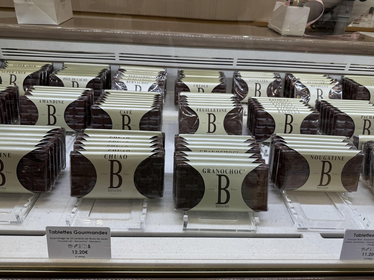 Gâteau du Présidentとレモネードを注文、2,717円でした。ガトー・デュ・プレジダンは1975年に当時のフランスの大統領の為に作られたケーキです。ノワゼットのプラリネを使った有名なケーキです。美味しいですが、大きいのでこれ一つでお腹いっぱいになります。客層は地元の人が大半でした。昨年食べたフランボワーズのアイスクリームが人気みたいで注文してる人が多かったです。空いていて居心地の良い、リヨンのお気に入りカフェです。隣はベルナシオンテイクアウト専門店でタブレット、パレドール、チョコ詰め合わせを購入して、お会計13,945円。ベルナシオンの他にフェルベールのジャムも売っていて種類豊富です。日本でもバレンタインの催事などで買えますがフランスで購入する方が断然安いです。