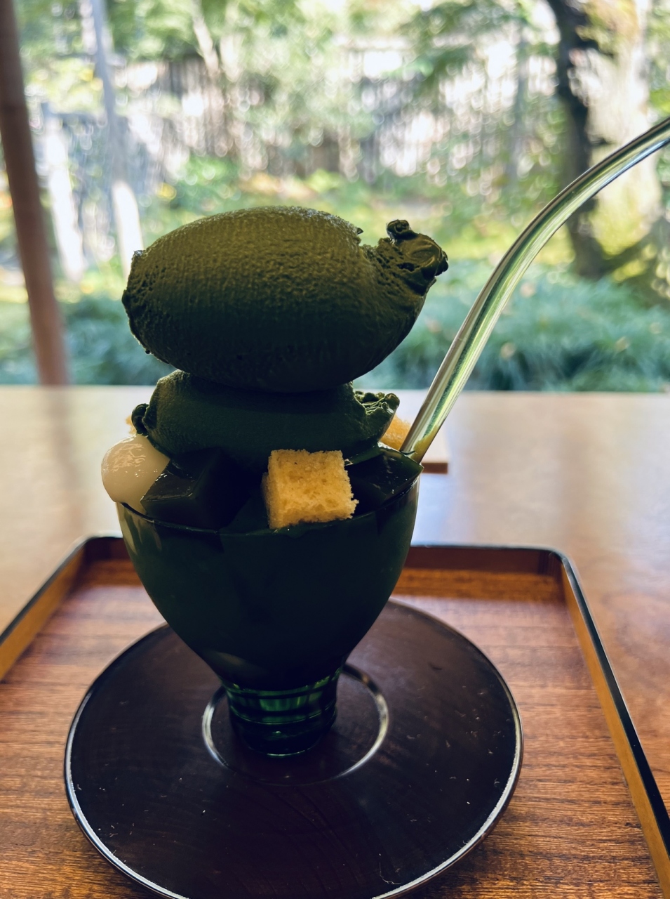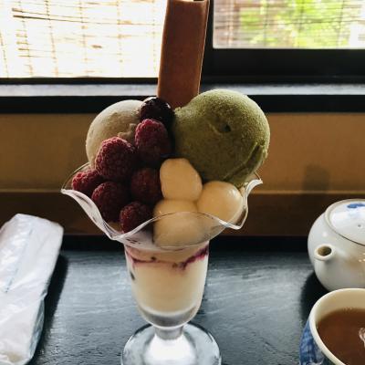 抹茶アイスが濃厚で抹茶好きにオススメのパフェです。アイスの他にはカステラみたいなのと抹茶ゼリー、白玉が入ってます。シンプルな大人のパフェです。お庭を眺めながら雅な京都の雰囲気も楽しめる空間です。ガラスのスプーンはオシャレですが、分厚くて丸いので少し食べにくいです。次はランチのお弁当を食べてみたいです。