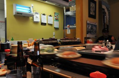 路地を入った所に、日本人の経営の「回転すし屋」があります。
