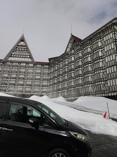ホテル建物前にある駐車場は台数少ないので離れた場所に置かなければなりません。