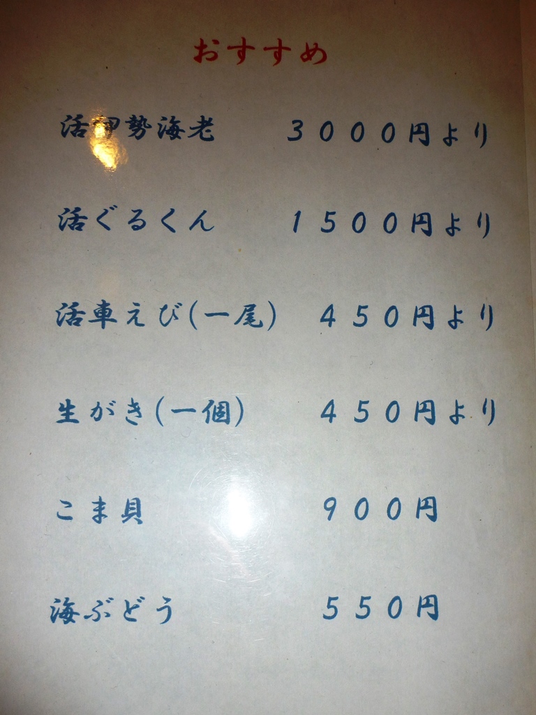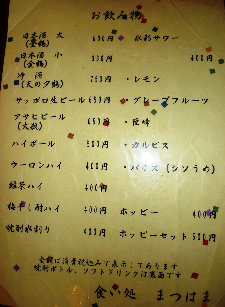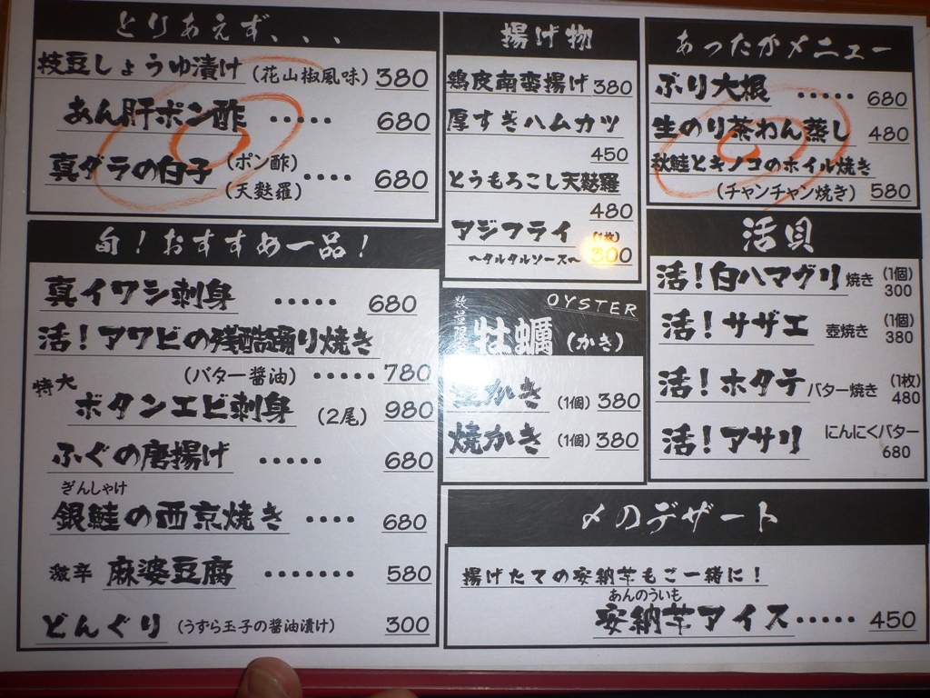 いつもは、居酒屋も予約するんですが、今回は予約なしで、ホテル(ルートイン)から適当に歩いていたら、通りから明かりが見えたのでのぞいてみました。