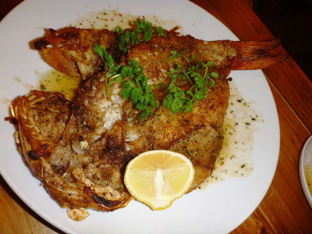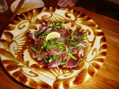カマイ(イノシシ)のタタキやミーバイ丸ごと1匹バターソテーなどをいただきました。特にミーバイのバターソテーは絶品でした。店を紹介してもらったダイブショップのオーナーの情報では、ピザも超オススメだとか。でも、泡盛を楽しみながら、まったり食事していたら、いつのまにかお腹が一杯になって、残念ながらピザへは辿り着けませんでした。