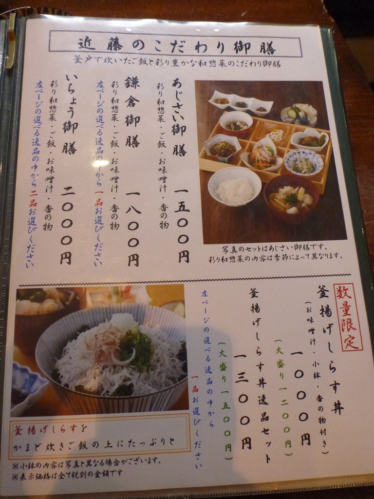 釜揚げしらす丼にも食指が動きましたが、基本の「あじさい御膳」1,500円と「鎌倉御膳」1,800円にしてみました。でも、結果的には、あじさい御膳×2で十分だったかも。