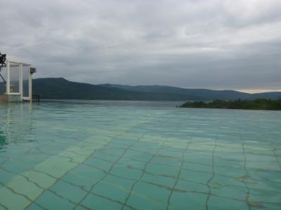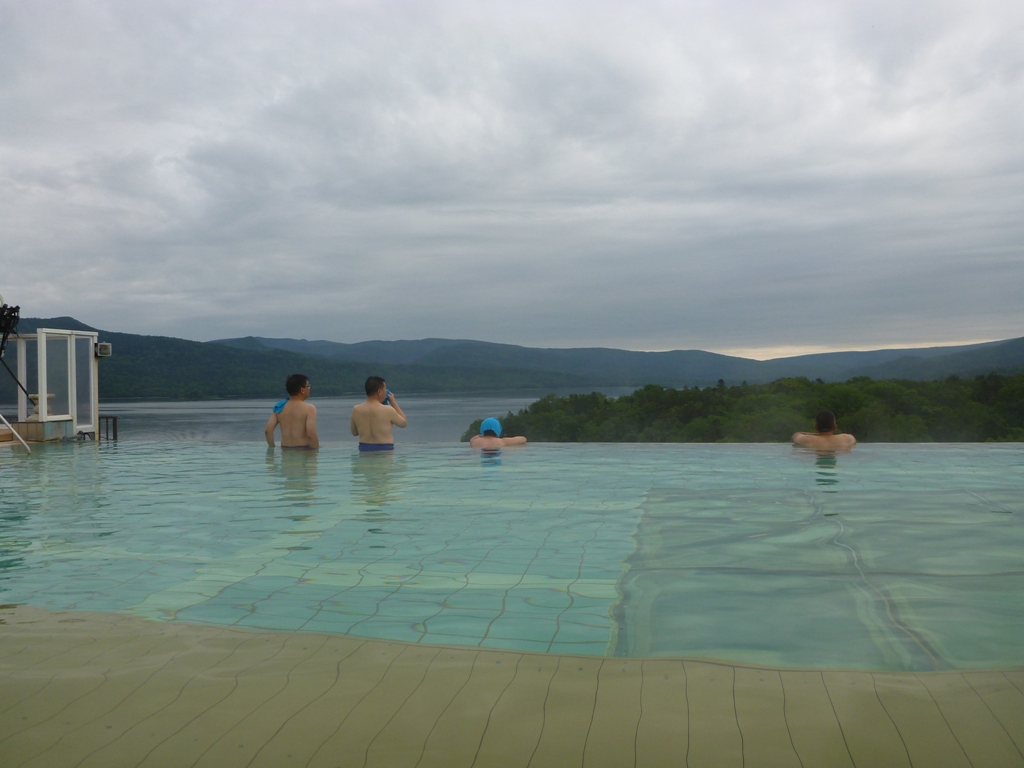 この宿で一番印象に残ったのが、この屋上スパ。小学校のプールを一回り小さくしたほどの広さがありました。シンガポールのマリーナベイ・サンズのインフィニティプールを彷彿させます。もちろん泳ぐこともできますが、湯船の中に沈めてあるビーチチェアを利用すると阿寒湖の水面との屋上スパの水面の高さが一体化して、阿寒湖に入浴しているような錯覚を覚えました。まるでマリモになった気分です!