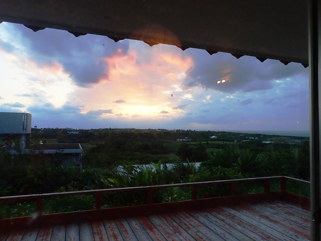 外観からは想像がつきませんでしたが、店内の西側と北側はガラス張りです。ちょうど、サンセットの時間で夕景色を楽しみながら、オリオンで乾杯ができました!