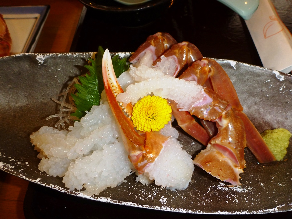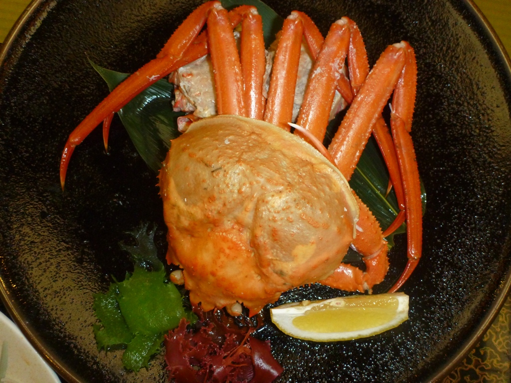 活き本ずわい蟹洗い、本ずわい蟹鍋、活き本ずわい蟹焼き、活き本ずわい蟹味噌甲羅焼き、本ずわい蟹天ぷら、活き本ずわい蟹姿一杯、蟹釜飯のコースで、活き本ずわい蟹を一人約2.7杯分使用。部屋付き、温泉付きで12,000円ならリーズナブルでは。