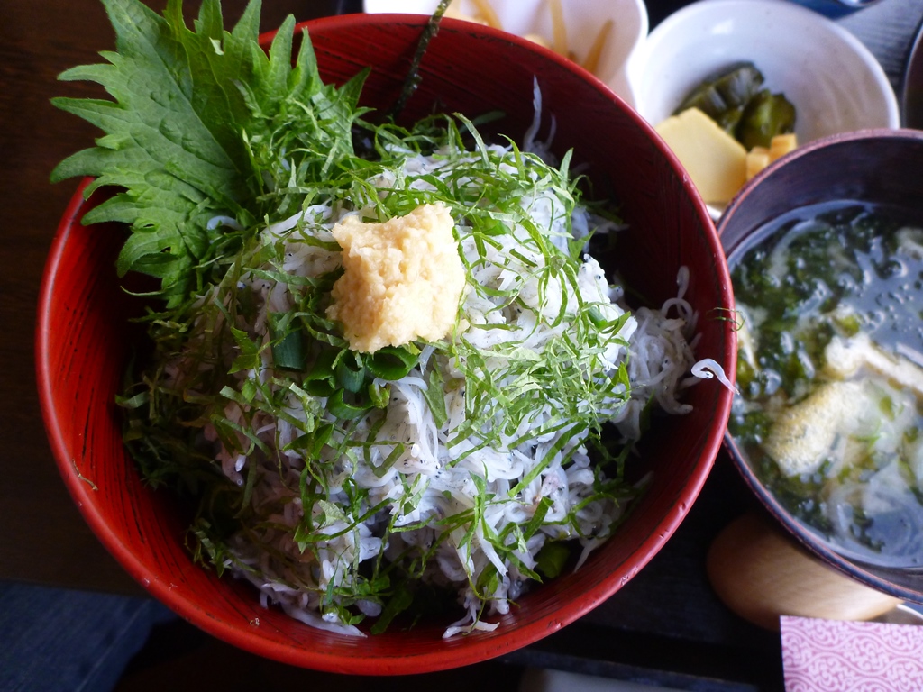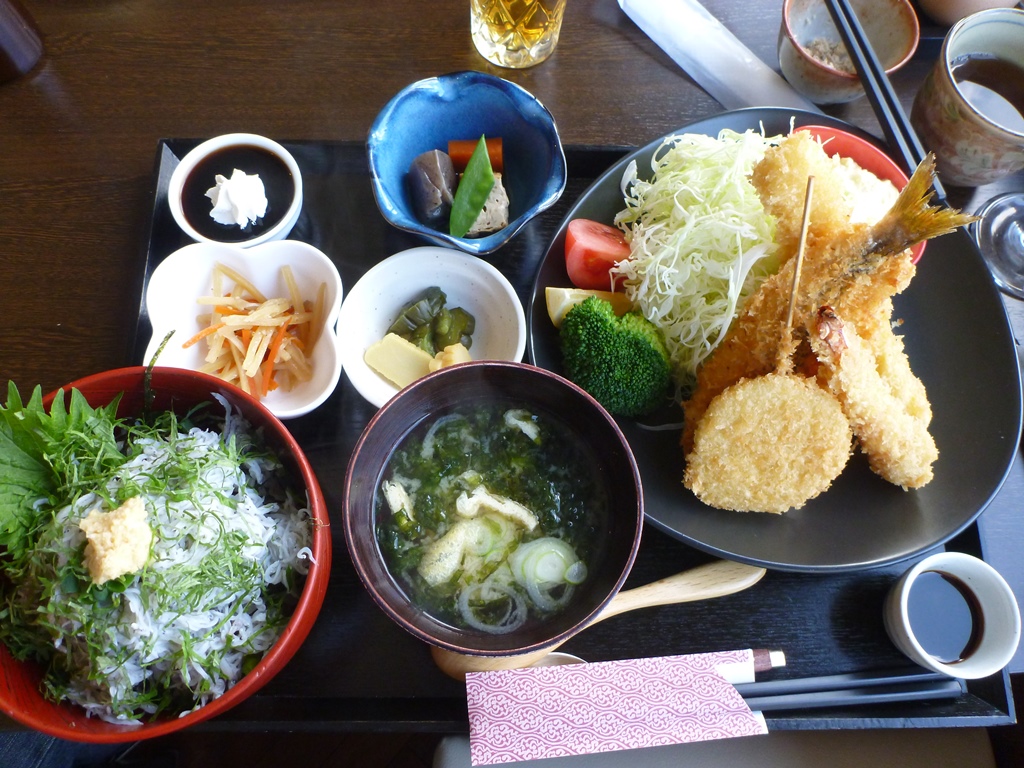 八幡野ダイビングセンターで、いい店だよと紹介されたので、行ってみました。ビーチダイビングを2本したあとで、おなかがすいていたので、シラス丼とミックスフライのセットにしてみました。1,500円でこのボリュームです。味もコスパとも大満足です。