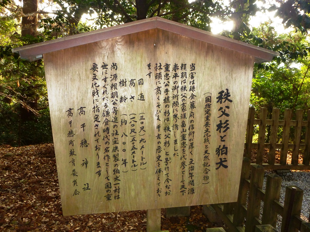 高千穂神社について、「境内には樹齢800年の秩父杉や、根本は一つで幹が二つの夫婦杉がある。」や「鉄造狛犬一対と本殿は、国定重要有形民俗文化財だよ。」ぐらいの基礎知識があれば、もっと興味をもって訪れることができたはず。