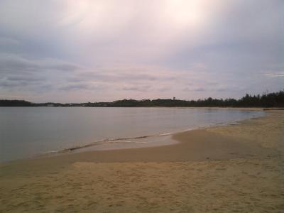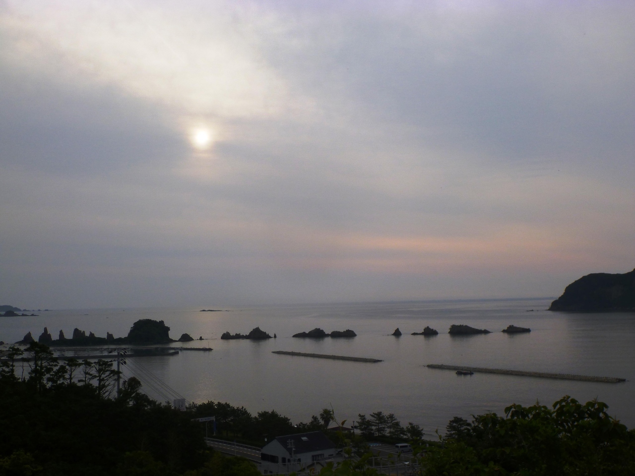 露天風呂からきれいな朝焼けが見られるとのことで、早起きして露天風呂へ。写真は、5時半過ぎです。残念ながらこの日は曇りで、朝日は雲の影にうっすらとしか見えませんでした。