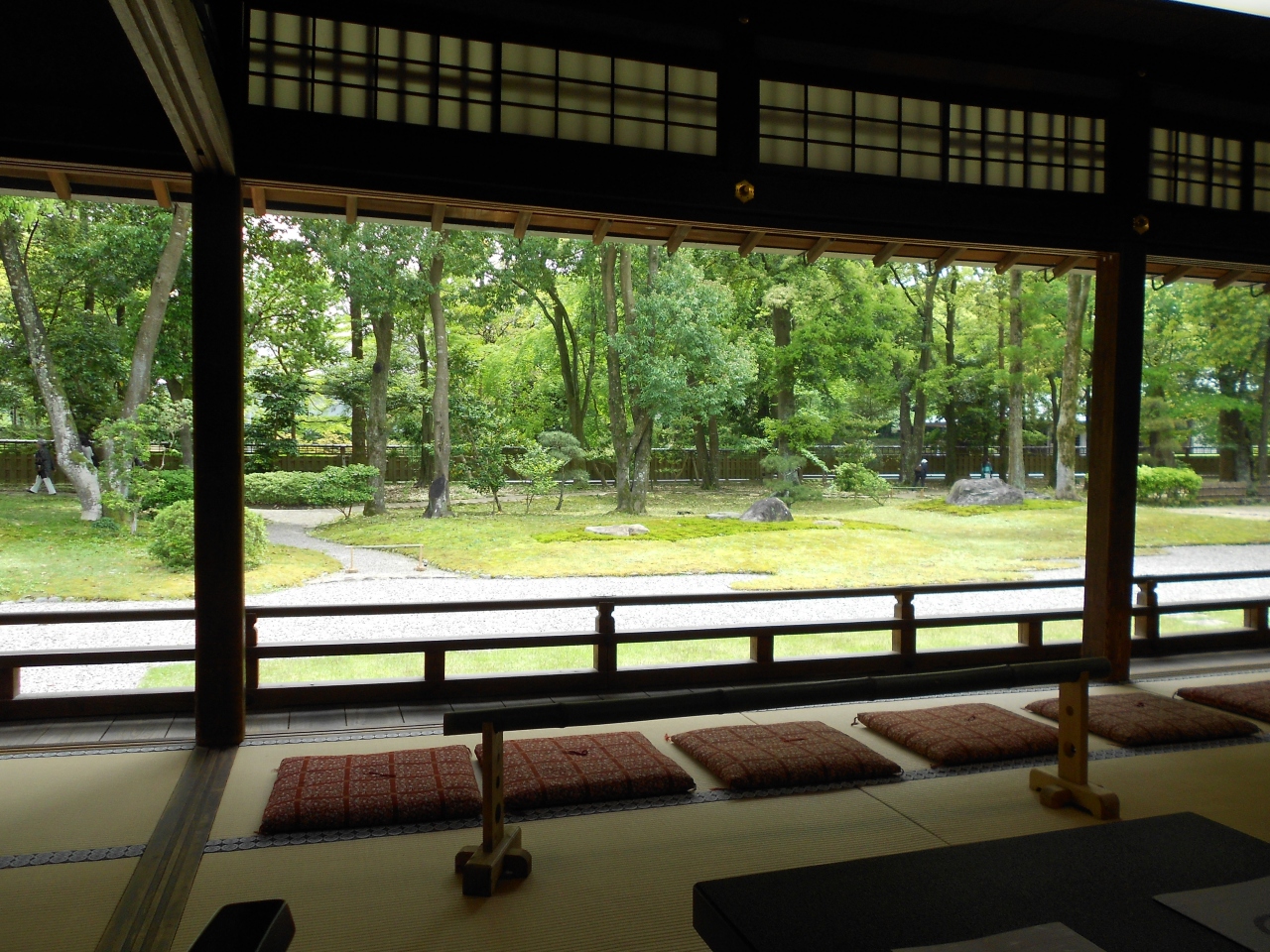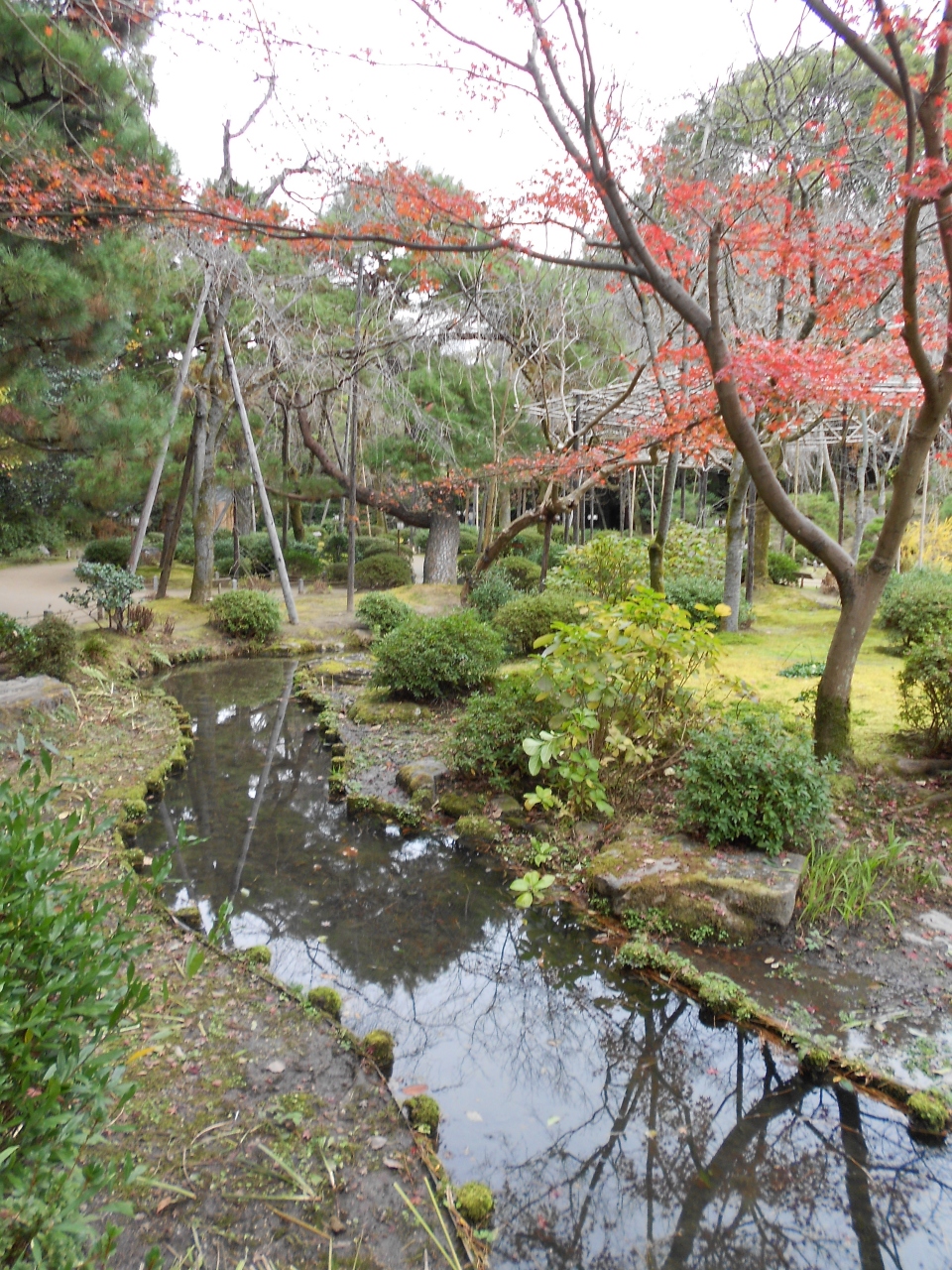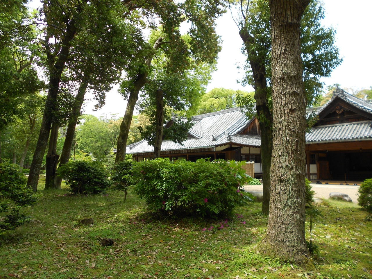 本殿の後ろ側を囲むように作られています。池が3つあり、見ごたえのある大きな日本庭園です。中でも池に渡された橋殿は幻想的でした。