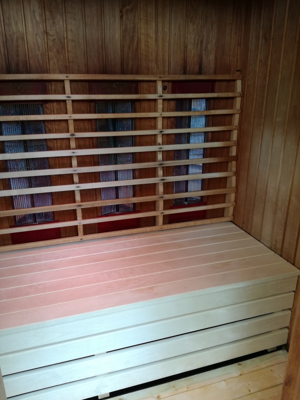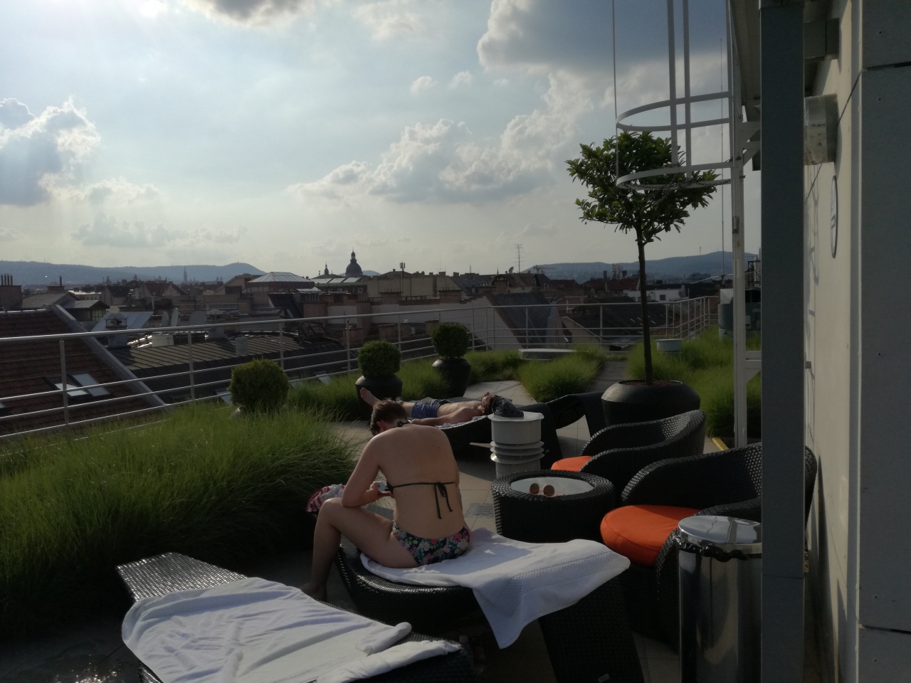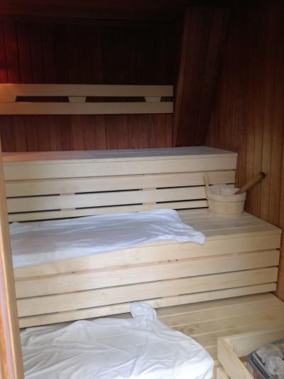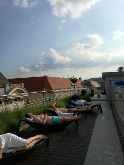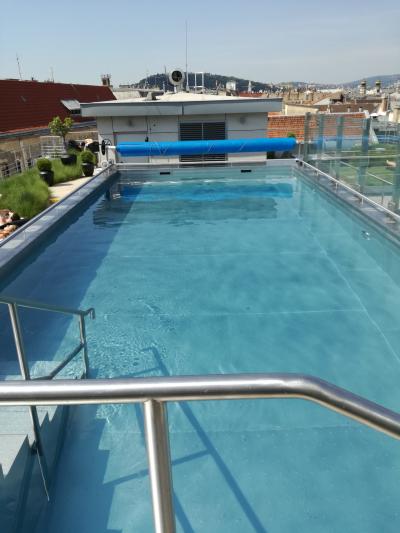 屋上に温水室内プール、外のプール、サウナ2種類があります。