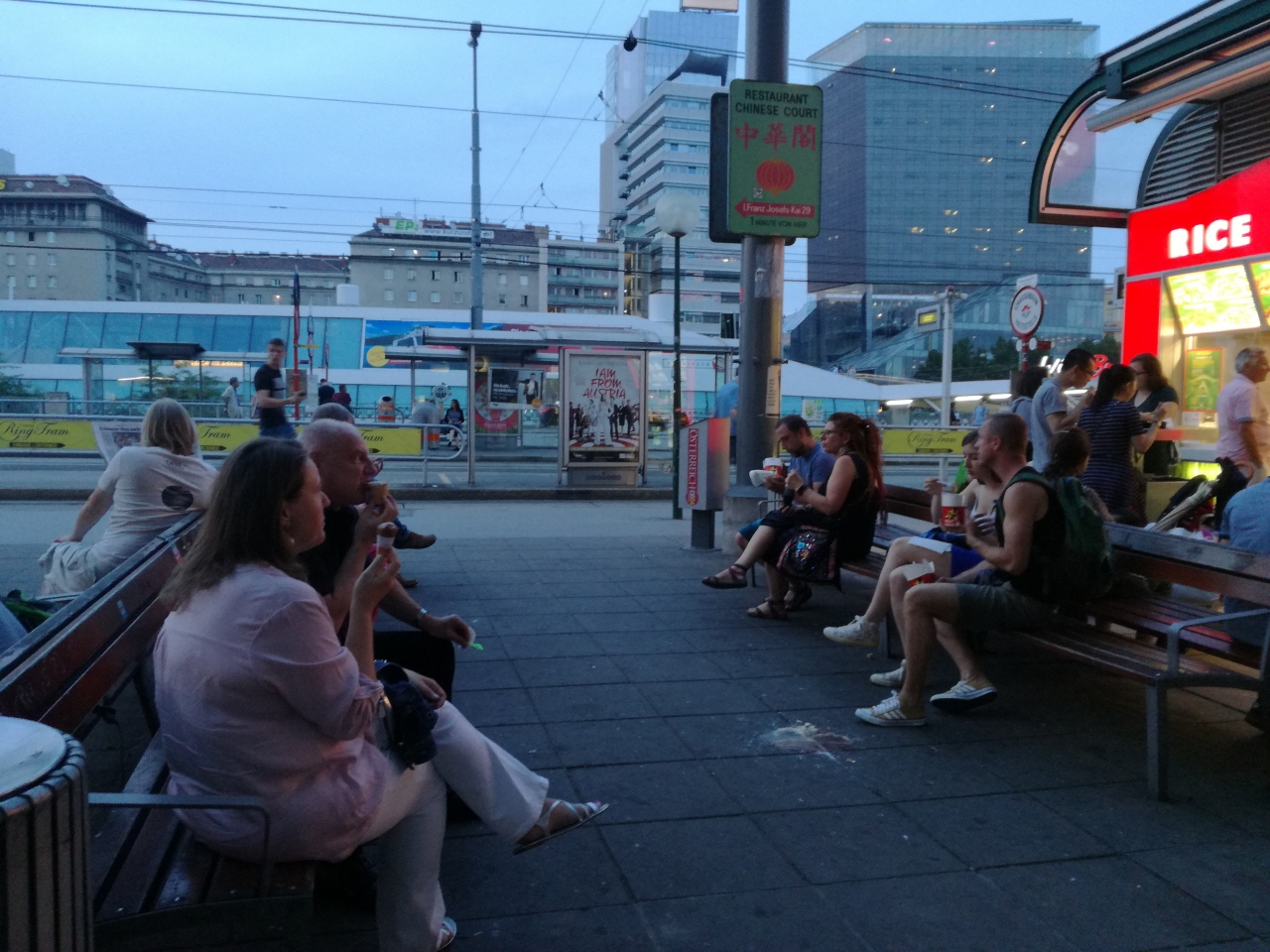 夕方はアイス屋さんの前で老若男女アイスをたべている。