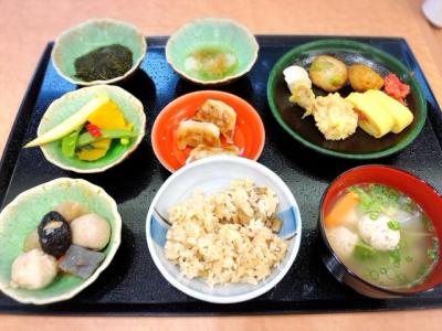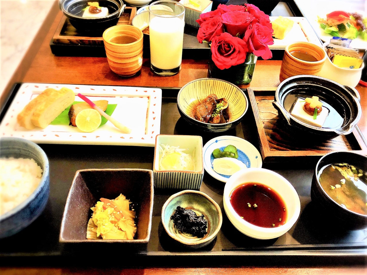 朝御飯は1階朝食会場(昼間は和食と中華のレストラン)で和定食が頂け、その他にビュッフェ台にある洋食も頂けます。