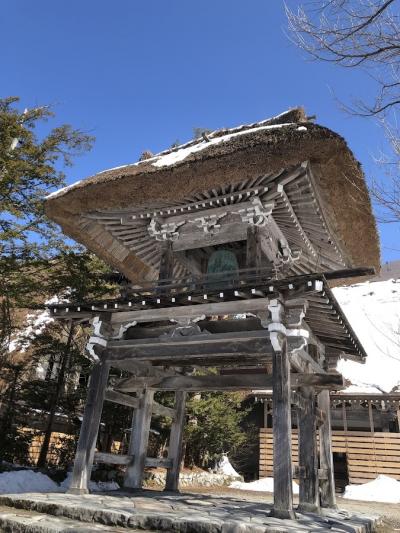 茅葺き寄棟屋根で1階に板庇をつけた珍しい鐘楼。