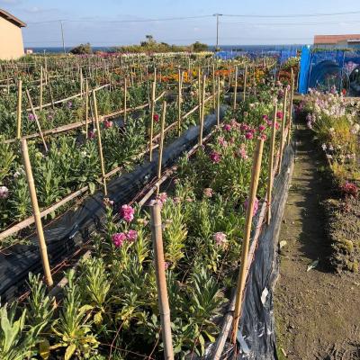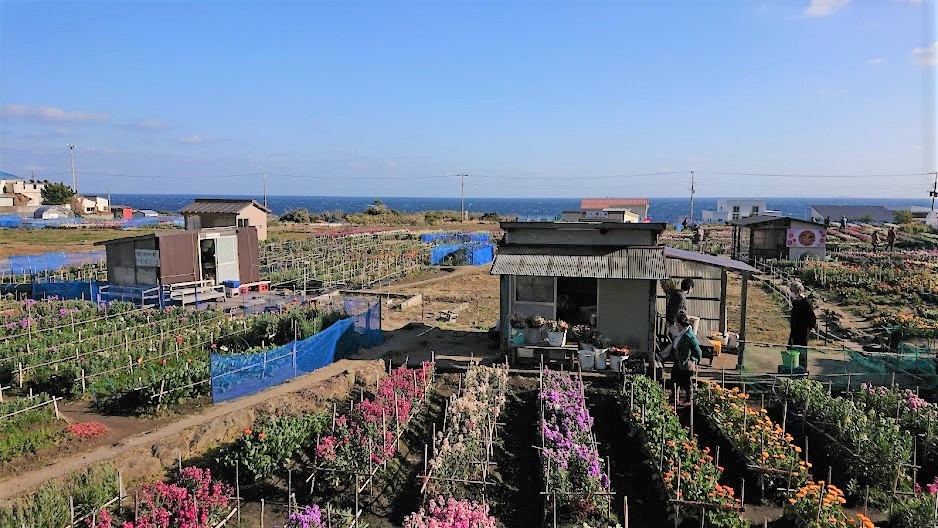 数件の田んぼ所有者がそれぞれ小屋を建てていて、花摘みの他に簡単にラッピングされた花も売っており宅配便での発送も行っています。
