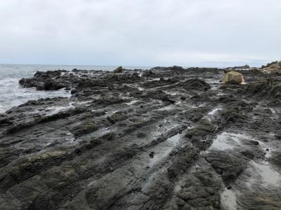 『ゴジラ岩へは此処から』と看板が有り、海岸に下りる簡易の階段があるので其方から行きますが、岩場を10分くらい歩きます。
