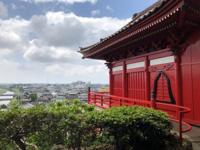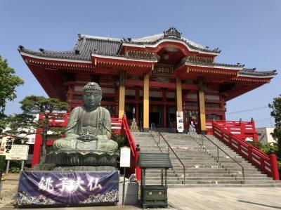 境内には朱色の五重塔と銚子大仏もあります。