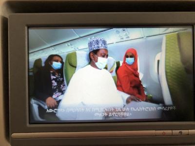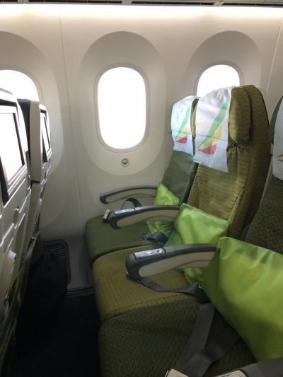 機材は初期導入のB787ー800型機、乗り込むと黄緑&黄色のエチオピア航空のコーポレートカラーの座席が眩いです。個人TVは画面が少し古いタイプの物でした。