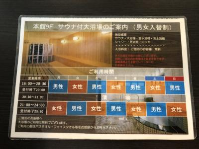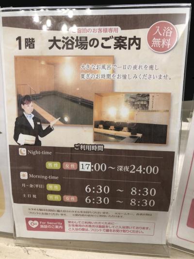 此方のホテルの注意点は大浴場が一箇所しか無いので男女時間制で振り分けられます。「入浴出来なかった」とのコメントも多数有るのでよくよく時間を考慮して入浴に向かって下さい。