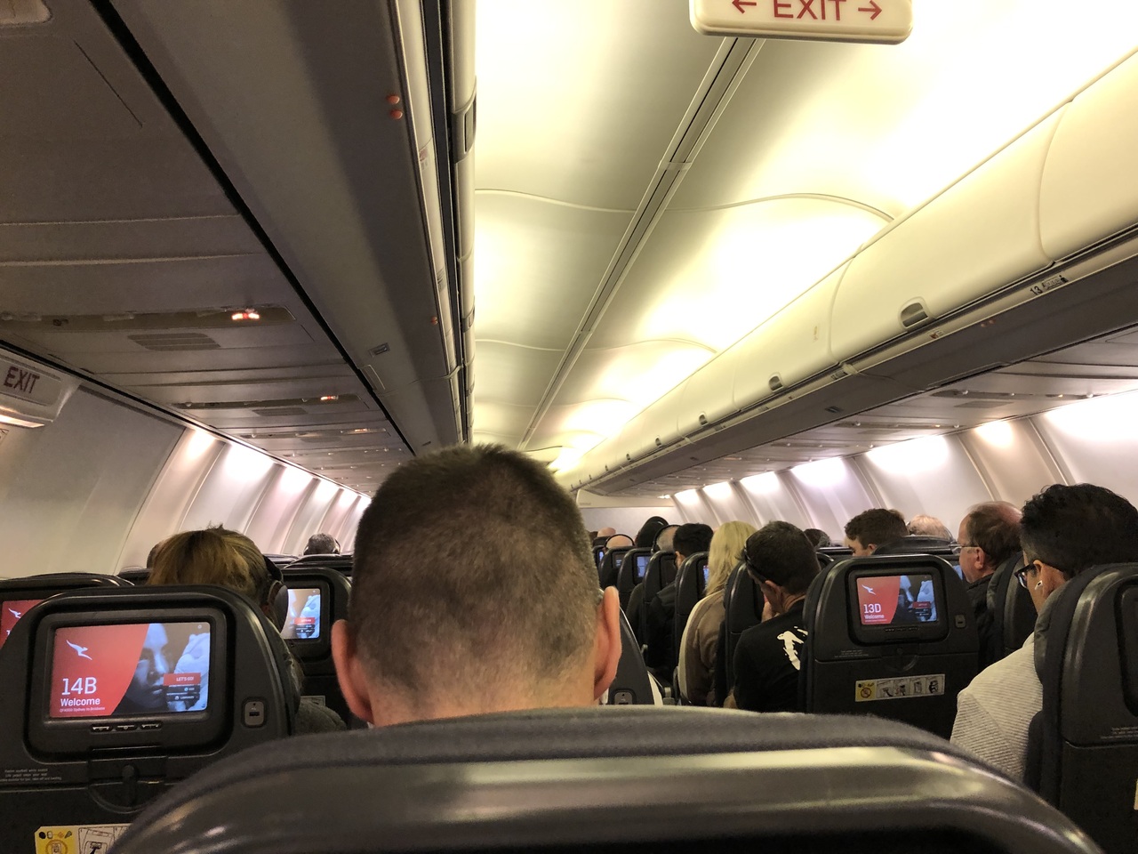 このフライトはQFの豪州主要都市間のメインのフライトで機材運用がタイトなのかまたまた遅延で満席でした。