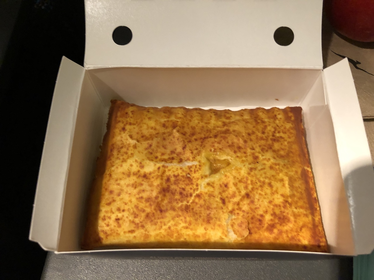 この夜便の機内サービスですが時間的に夕食時で温められたバターチキンパフが配布されました。