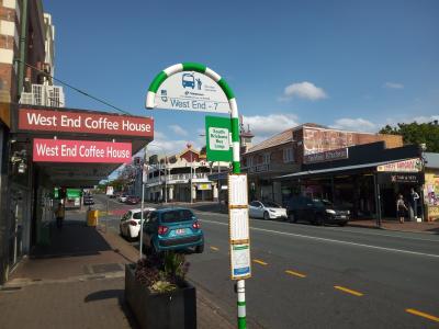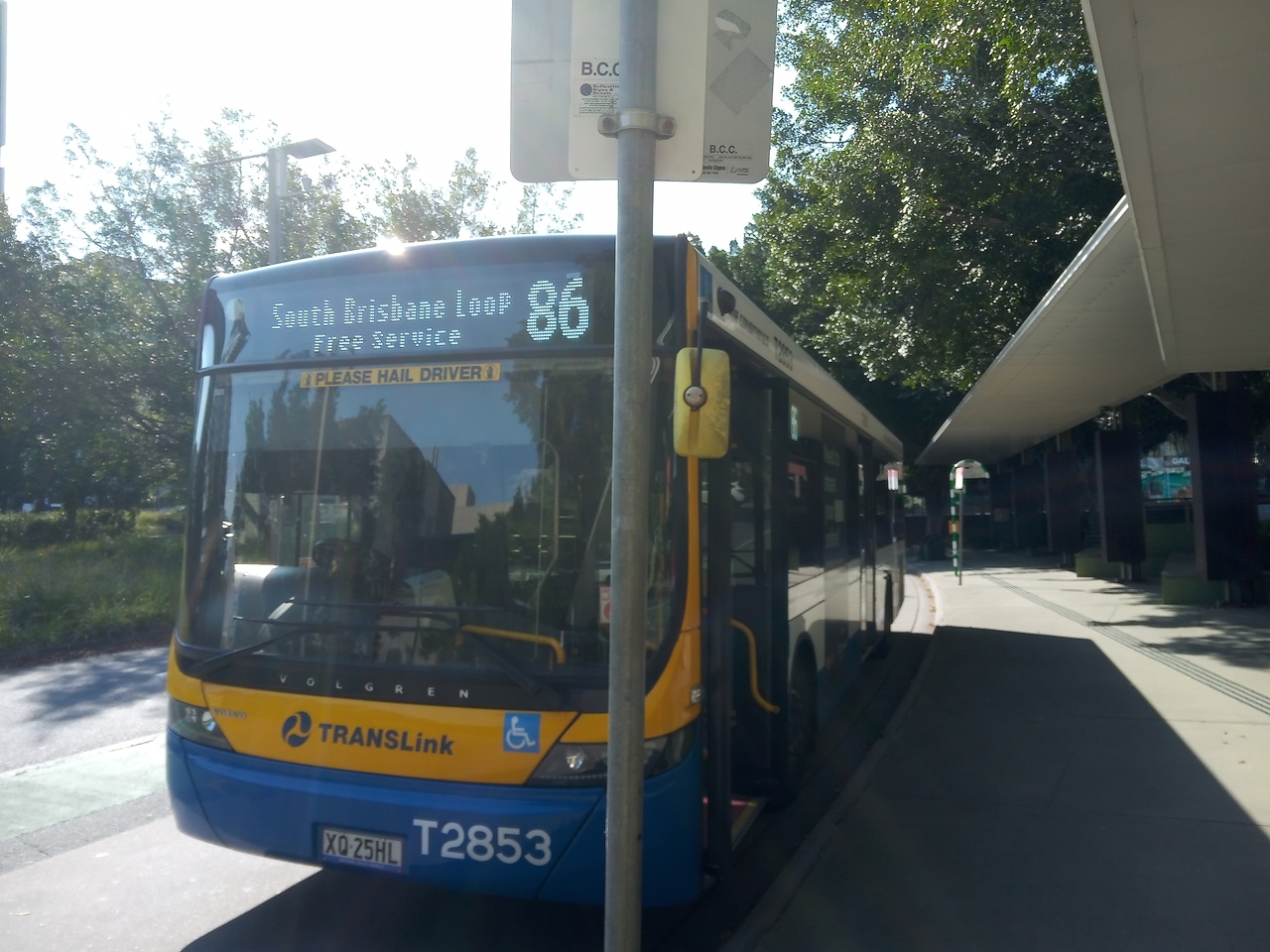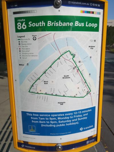 ブリスベン市内人気の観光地のブリスベン川沿いのサウスバンクエリアとお洒落な街ウエストエンド地区を無料で巡回運転する「South Brisbane Bus Loop 86番」のバスです。