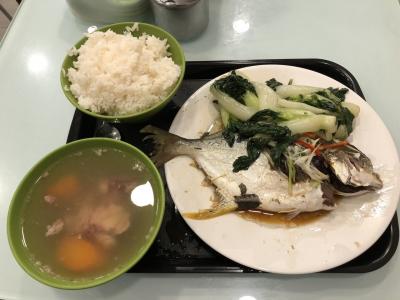 カウンターのおばちゃんはささっとトレーを充備して大きなお皿に魚と青菜を盛り付けてスープとライスも付けてくれて(ライスとスープはどうやってオーダーするのか分からなかったから丁度よかった)完成です。