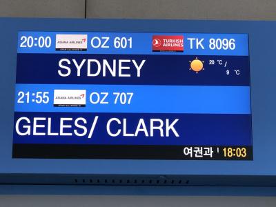 アシアナ航空601便・ソウル・インチョン(20:00着)⇒シドニー(07:30+1日)の飛行時間約10時間30分の夜行便を利用。