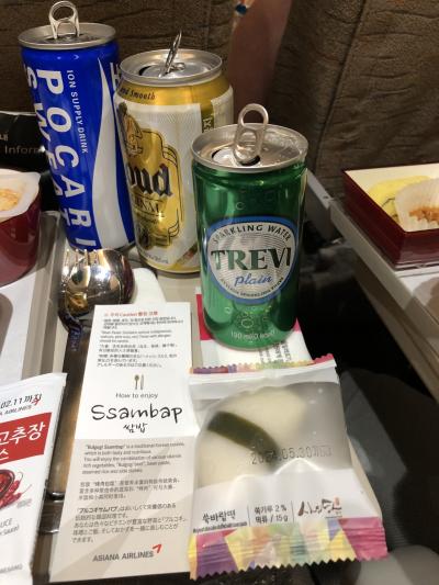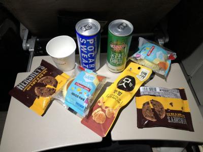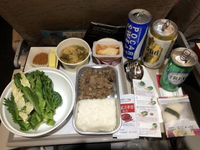 でこの便では韓国料理のホットミールの夕食と到着前の朝食に有りつけます。