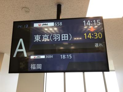 今回利用したのはその第1区間、JAL658便・奄美大島(14:15発)⇒東京/羽田(16:20着)の所要時間2時間05分のゴールデンウィーク明けの満席の東京行き直行便です。使用機材到着遅れで15分遅延でした。