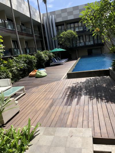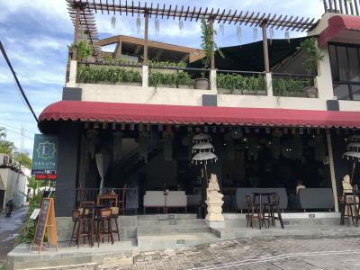 クタビーチ沿いのメインストリートからお寺の横を通るポピーズ2通りに面して建っている低層階の奥に長い新し目の綺麗な開放的なホテルです。