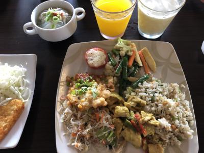 カシューナッツ入りチキンに炒飯青菜添え。中華風の料理を選択です。ホッカチャの温かいパンを渡されます。